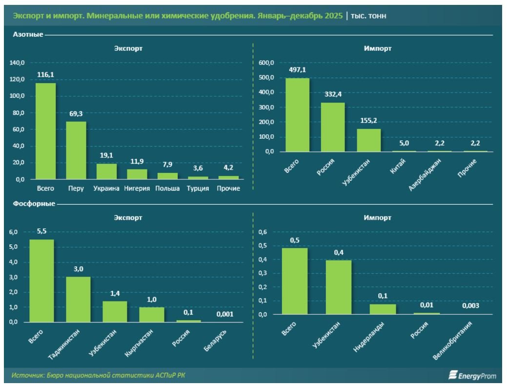 В то же время отечественные производители, такие как «КазАзот» (Актау) и «КазФосфат» (Жамбылская область), экспортируют продукцию для получения валютной выручки и обеспечения непрерывной работы заводов в межсезонье, когда внутренний спрос падает.