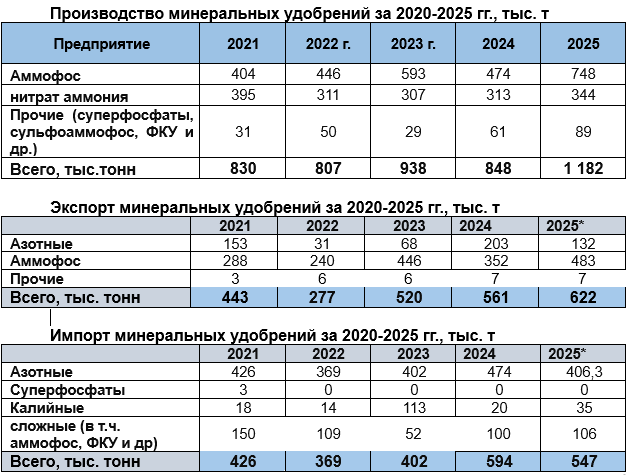 В прошлом году отрасль показала исторический максимум производства — 1182 тыс. тонн. Это на 39 % больше, чем в 2024 году (848 тыс. тонн). Больше всего произвели (748 тыс. тонн) и продали (483 тыс. тонн) аммофоса. Считается, что его можно вносить под любую культуру (пшеница, кукуруза, картофель) и на любых типах почв.