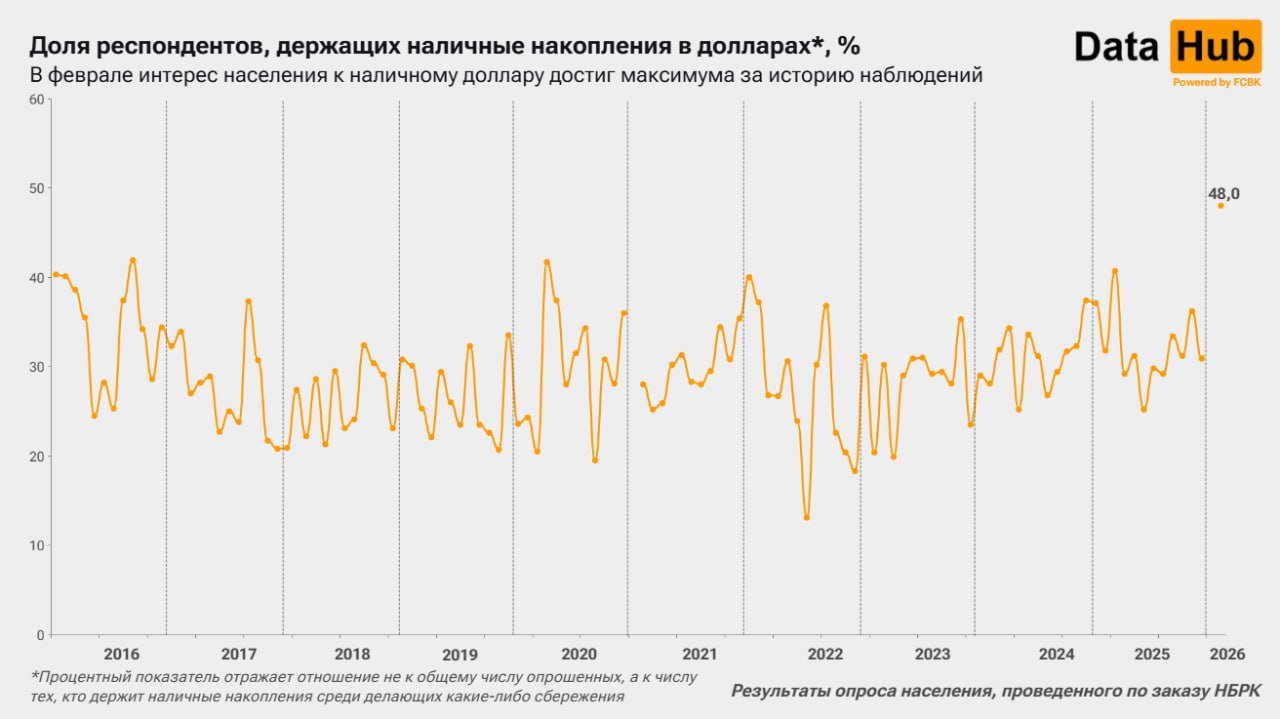 В феврале доллар для наличных накоплений выбрали 48 % респондентов, которых опросили по заказу Нацбанка. За год показатель вырос на 16,2 процентного пункта. Это максимум за весь период наблюдений с января 2016 года.
