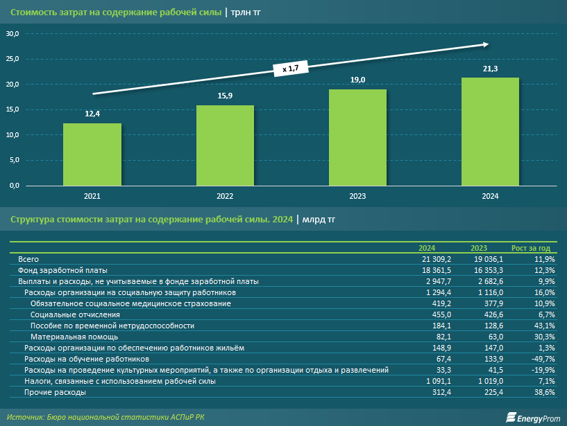 Как подсчитали аналитики Energyprom.kz, в целом за прошлый год расходы казахстанских работодателей на содержание сотрудников выросли на 11,9 % — они достигли 21,3 трлн тенге. 86,2 % от этих расходов составляет заработная плата. По итогам 2024 года казахстанские компании заплатили своему персоналу 18,4 трлн тенге (+12,3 % за год).