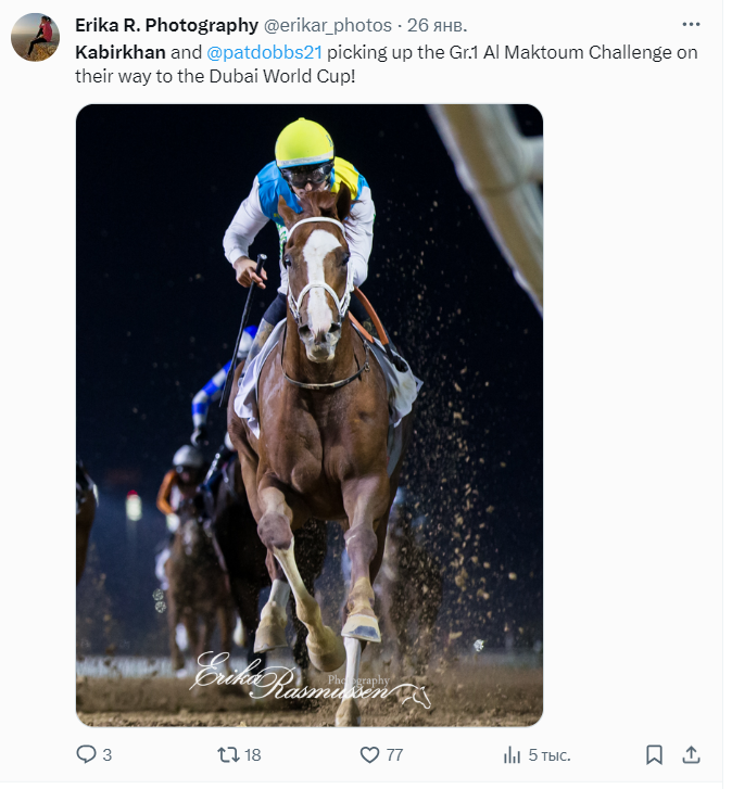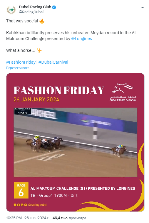 «Эта лошадь из Кентукки, принадлежащая Казахстану и обученная в России, выступает на ипподроме ОАЭ», — пишет издание.