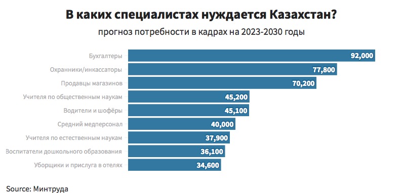 «Если смотреть на более агрегированный показатель, то можно отметить, что самыми востребованными будут: специалисты-профессионалы в области образования – 12,5% от всей потребности, водители и операторы подвижного оборудования – 8,2%, специалисты-профессионалы в сфере бизнеса и администрирования – 6,8%, работники служб, осуществляющих охрану граждан и собственности – 5,3%, уборщики и прислуга – 5,1%», – сообщил заместитель директора Департамента прогнозирования ЦРТР Кайырбек Аяшев.