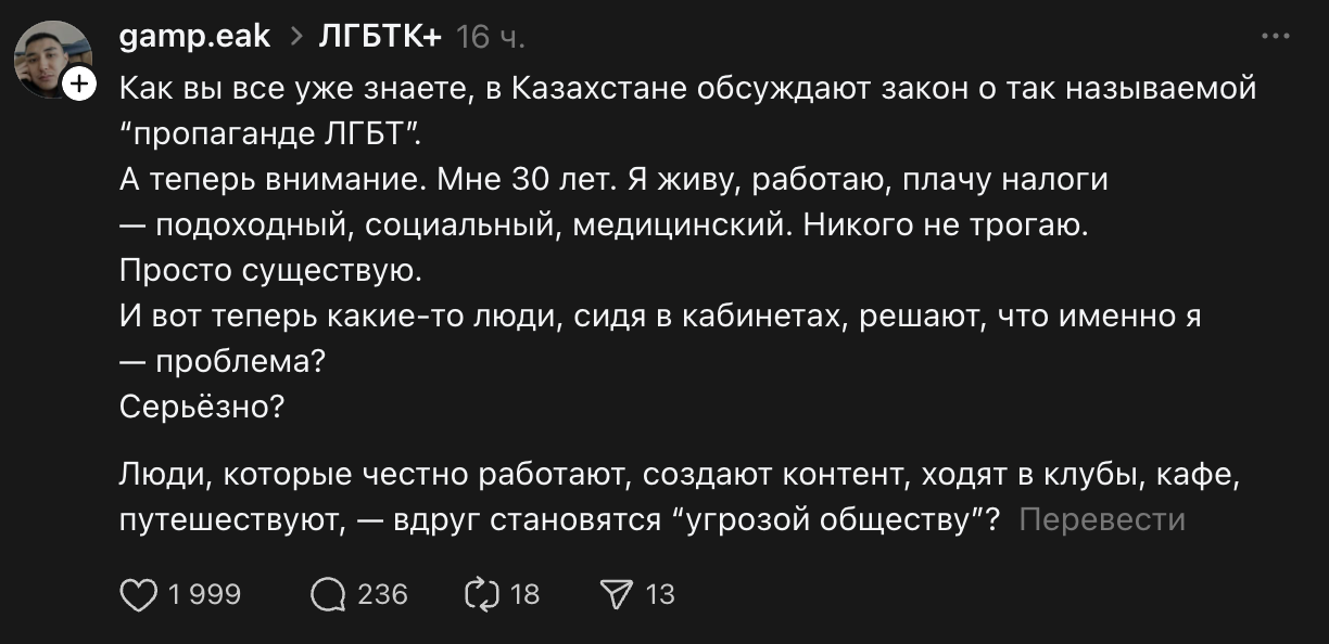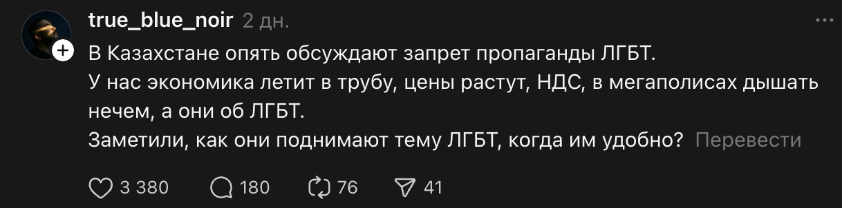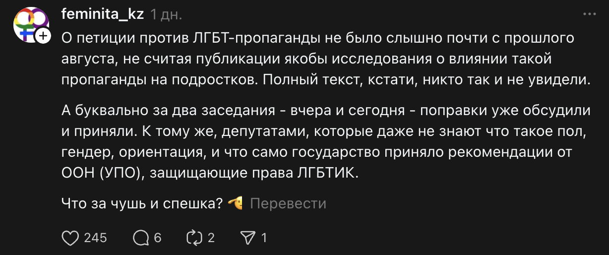 В мажилисе рассматривают поправки о запрете «пропаганды ЛГБТ» в Казахстане. Ограничения хотят распространить на кино, соцсети, рекламу и иной контент. За нарушение — штраф до 157 280 тенге или арест до 10 суток. Депутат Ирина Смирнова говорит, что запрет не коснётся самих представителей ЛГБТ-сообщества, а только «пропаганды». Что именно понимается под «пропагандой», она не пояснила. В России аналогичный закон стартовал как «защита детей», а затем стал распространяться на всех.