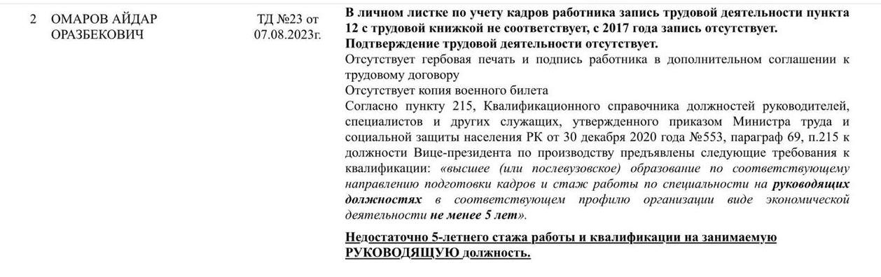 В качестве конкретного нарушения она привела только вот такую выдержку из отчёта одной из проверок, проведённой в 2023 году. В ней сказано, что у Айдара Омарова не хватает опыта на руководящей должности.
