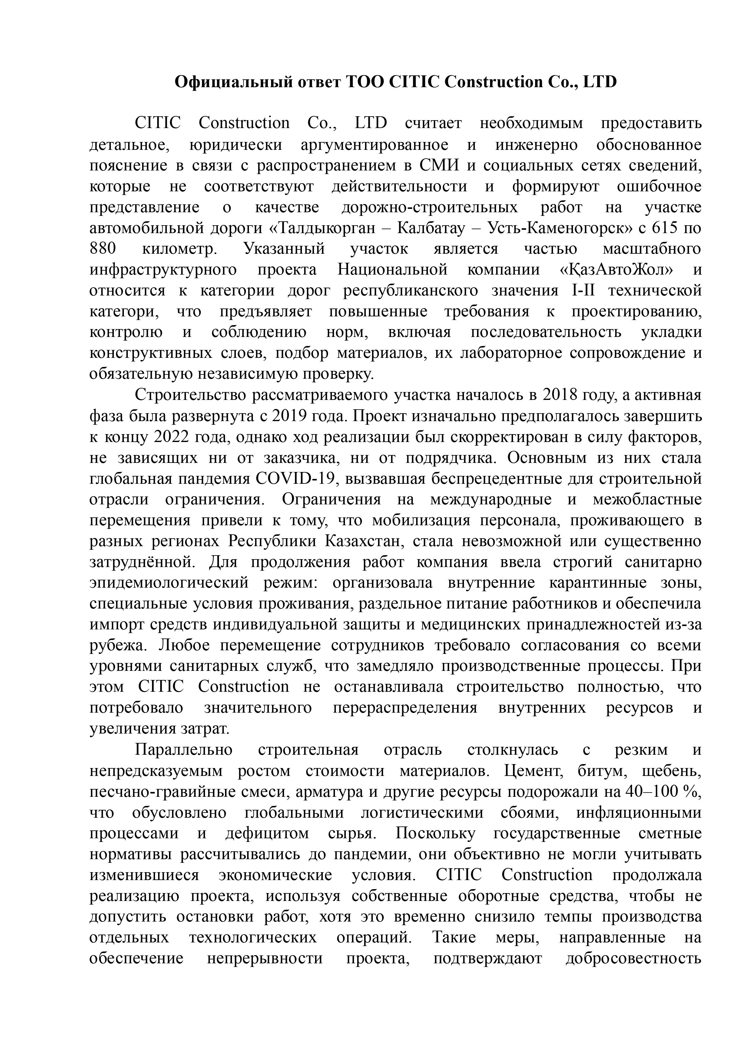 В редакцию Orda.kz поступило письмо от китайской компании CITIC Construction, в котором она прокомментировала критику общественника области Абай Роллана Машпиева в отношении качества работ на трассе Алматы — Усть-Каменогорск.