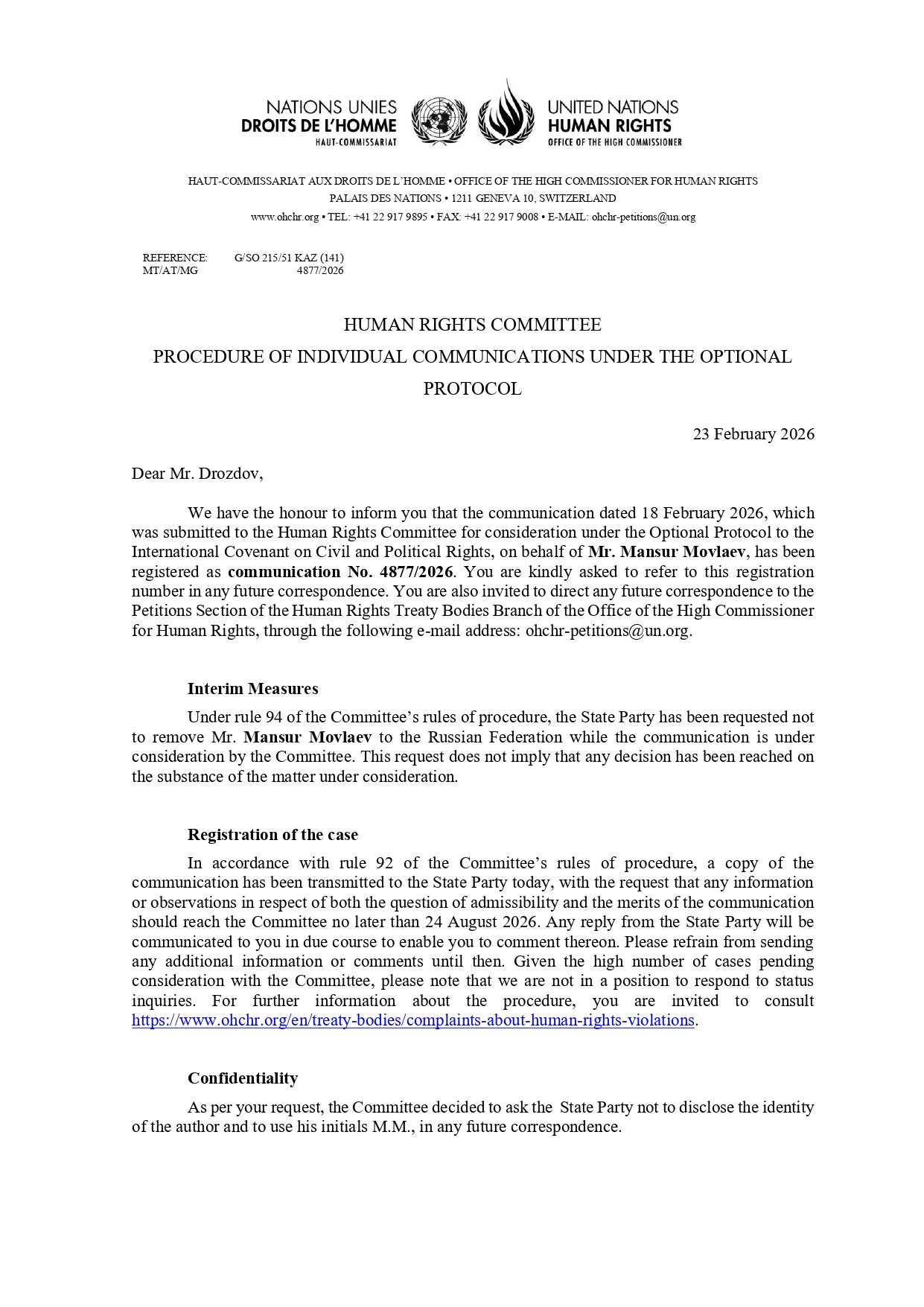 Комитет ООН по правам человека решил применить срочные меры и потребовал от Казахстана воздержаться от передачи уроженца Чечни Мансура Мовлаева российским властям до рассмотрения его жалобы по существу 24 августа 2026 года, сообщает Orda.kz.