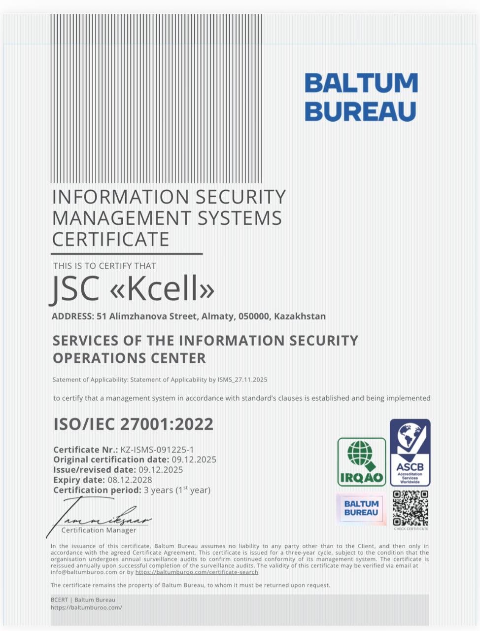 «Кселл» прошёл международную сертификацию по стандарту ISO/IEC 27001:2022, подтвердив соответствие требованиям одного из ключевых мировых стандартов в сфере информационной безопасности.