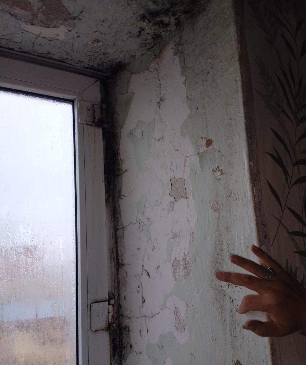 Супруги Суюнжановы сделали румтур. Трещины на стенах повсюду — они тянутся от потолка, на стыках стен, вокруг дверных проёмов, на цементном полу под линолеумом. Штукатурка отваливается. Изморозь на откосах и входной двери изнутри. От полотна межкомнатных дверей отошла, обшарпалась бумага.