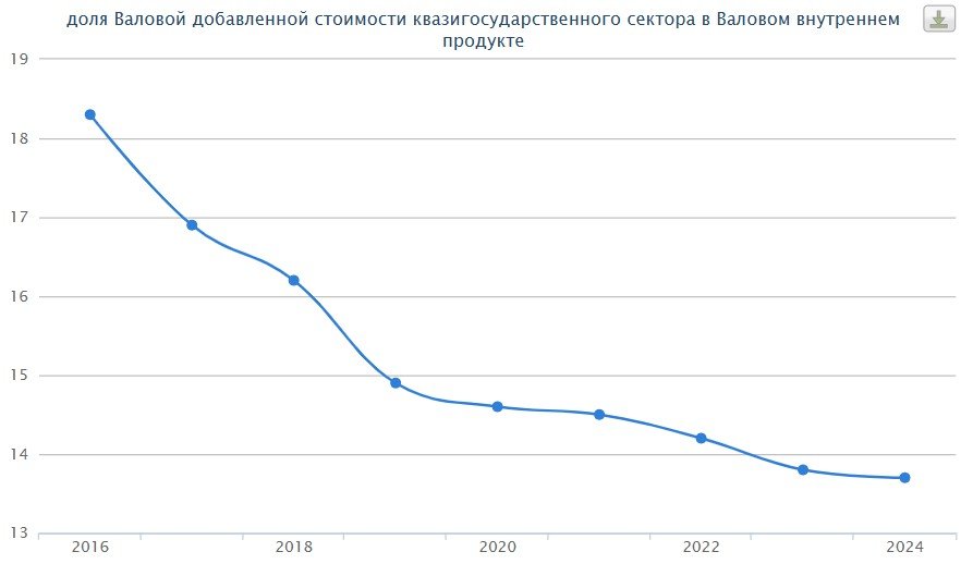 В 2016 году производство в квазигоссекторе обеспечивало, ни много ни мало, 18,3 % ВВП Казахстана. А дальше этот показатель только падал. К 2024 году он сократился до 13,7 %.