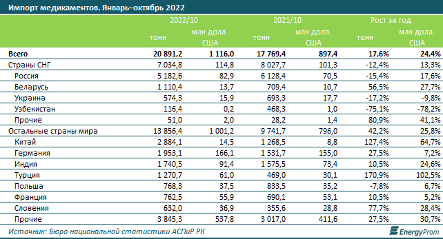 Что касается импорта, то Казахстан завёз 20,9 тысячи тонн медикаментов на сумму 1,1 млрд долларов США. Из стран СНГ доставили семь тысяч тонн. Основной объём импорта пришёлся на Россию: 5,2 тысячи тонн — на 15,4% меньше, чем годом ранее. Также в тройке ключевых поставщиков из СНГ оказались Беларусь и Украина.