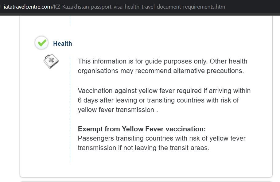 Ещё один солидный источник, где есть такая же информация, — это сайт iatatravelcentre.com. Это одна из платформ Международной ассоциации воздушного транспорта. На ней можно найти сведения из базы данных TIMATIC — справочника, который предоставляет информацию о правилах въезда во все страны мира. В разделе «Здоровье» о въезде в Казахстан там тоже сказано, что нужен сертификат о прививке от жёлтой лихорадки.
