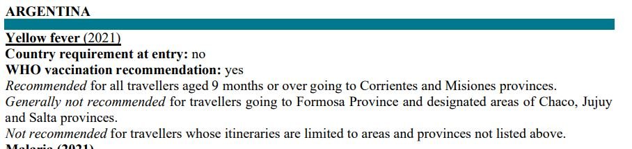 В графе об Аргентине конкретизируется, что жёлтой лихорадки нужно опасаться не по всей стране, а только в нескольких провинциях.
