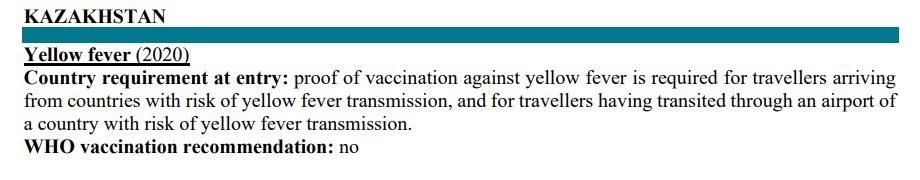 Такая же информация есть в рекомендациях ВОЗ для международных перелётов в страны-эндемики по жёлтой лихорадке, полиомиелиту и малярии. Самые свежие из них датированы 2022 годом и в них о Казахстане сказано так:
