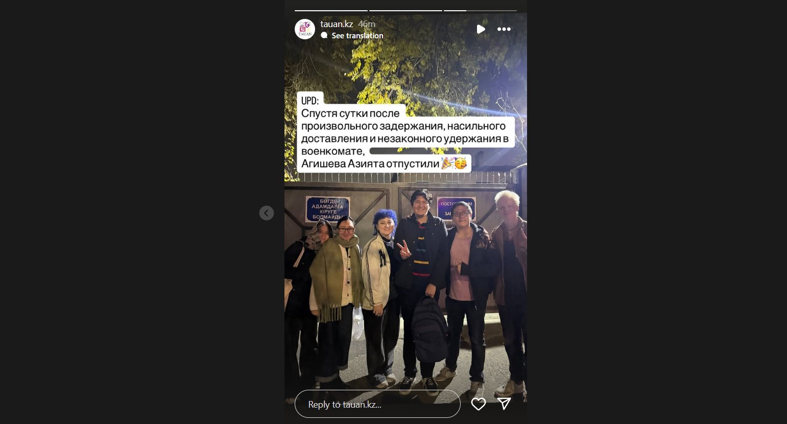 «Спустя сутки после произвольного задержания, насильного доставления и незаконного удержания в военкомате Азията Агишева отпустили», сообщили в фонде Tauan.