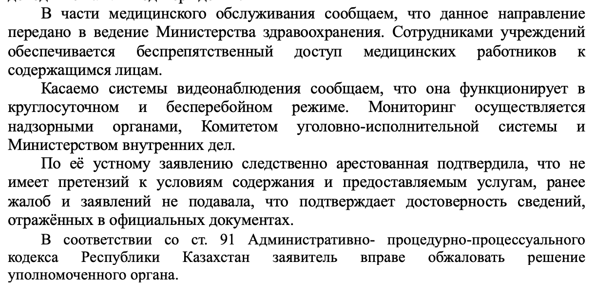 В Комитете уголовно-исполнительной системы провели служебную проверку и эти утверждения не подтверждают. Там заявили, что видеонаблюдение работает круглосуточно, доступ к медицинской помощи обеспечен, а условия содержания соответствуют установленным требованиям.
