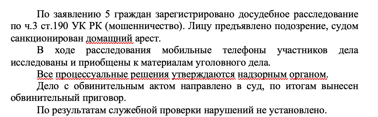 В прокуратуре Акмолинской области пояснили: квалификация действий как мошенничества была дана следствием и подтверждена судом на основе совокупности доказательств. Там же подчеркнули, что вопросы допустимости доказательств и их оценки находятся в исключительной компетенции суда.