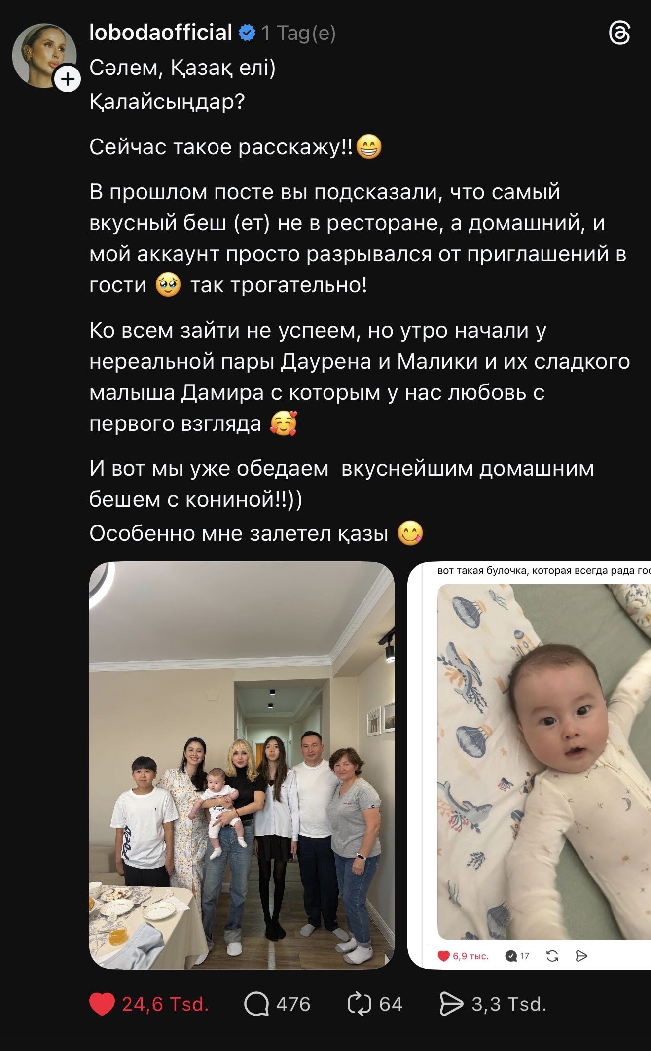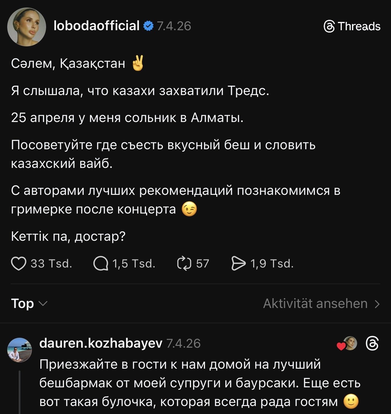 Началось всё с того, что Лобода решила поделиться в Threads новостью о своём сольнике в Алматы и заодно поинтересовалась у казахов, где самый вкусный беш. Фанаты единодушно ответили: не в ресторанах, а дома. И пригласили к себе.