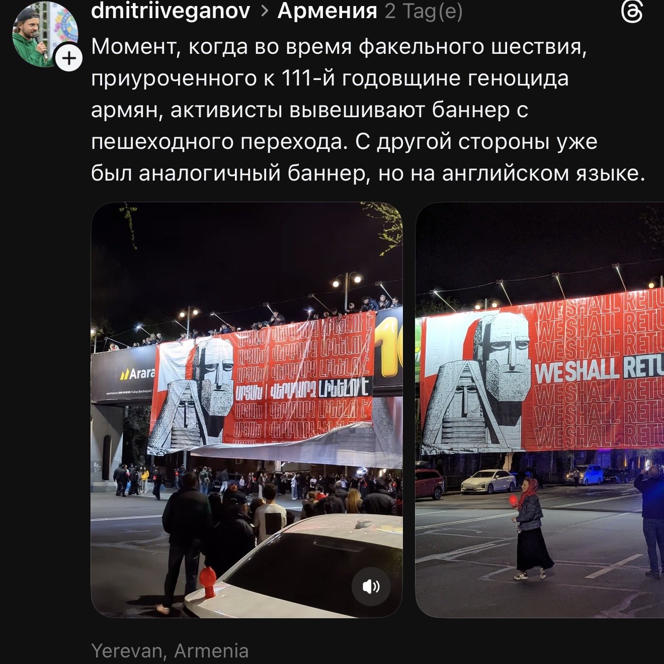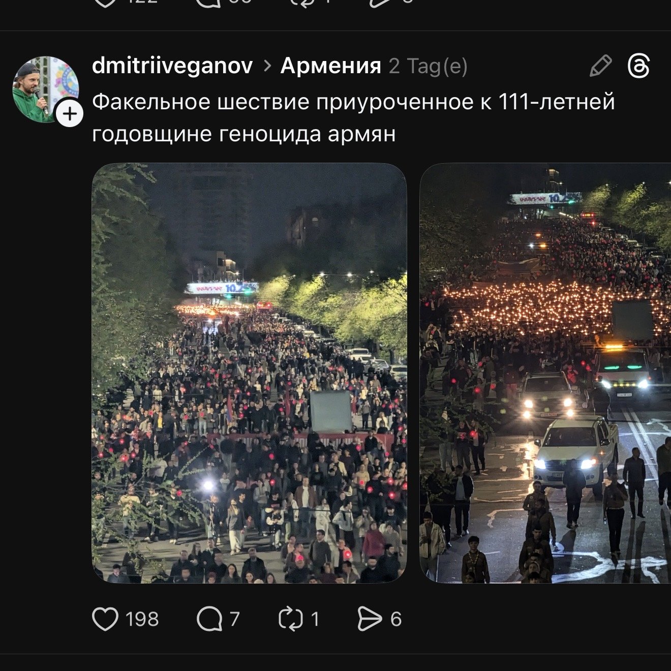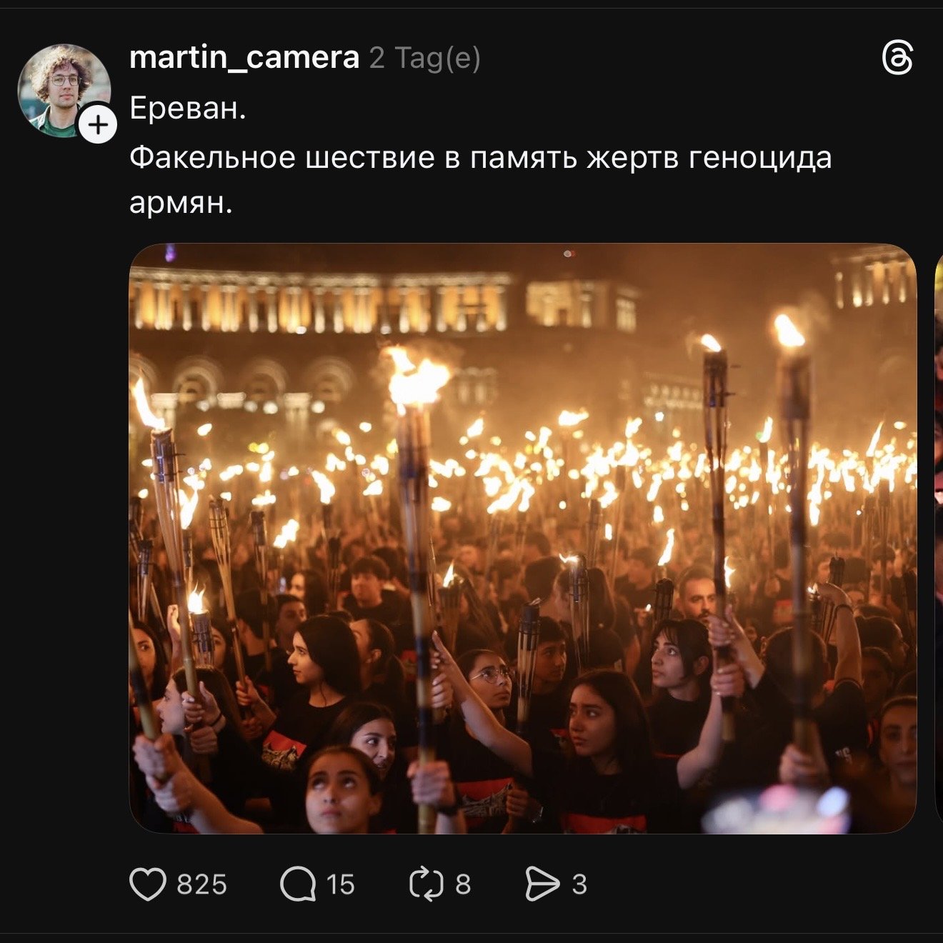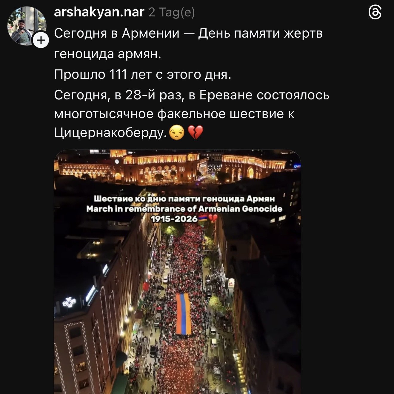 В Армении прошли траурные церемонии в память о жертвах геноцида армян. 23 апреля в Ереване состоялось традиционное факельное шествие — тысячи людей с зажжёнными факелами и флагами молча прошли от площади Республики по центральным улицам города.