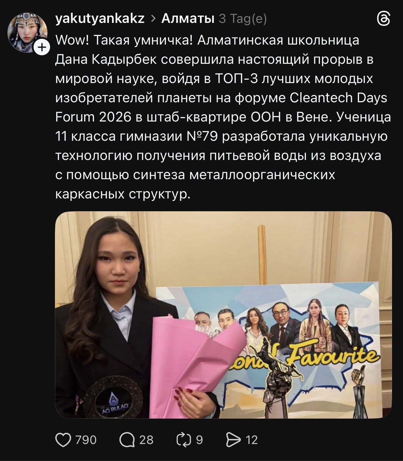 Дана Кадырбек, ученица гимназии № 79 из Алматы, вошла в топ-3 молодых изобретателей мира. Её отметили на Cleantech Days Forum 2026 в Вене. Событие быстро разошлось и восхитило не только казахстанцев.