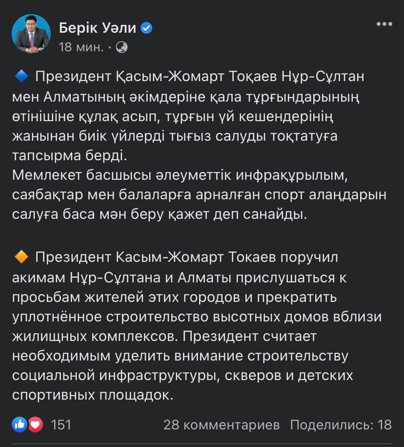 - Токаев поручил прекратить уплотнённое строительство в столице и Алматы