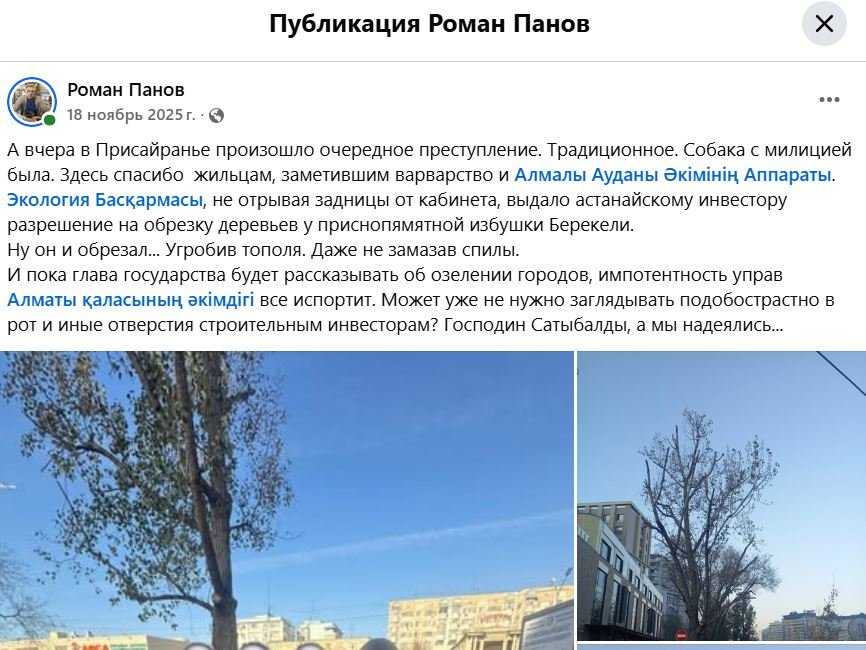 Редакция запросила комментарий и по этому поводу. В управлении экологии ответили, что для организации проезда с территории ЖК на Толе би застройщику разрешили убрать деревья, чтобы сделать дополнительный заезд. А разрешение на обрезку хотя и выдали, но признали, что она была произведена с нарушениями, и обрезчика привлекли к административной ответственности после обращения жителей.