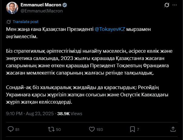 Макрон написал пост на казахском языке после разговора с Токаевым