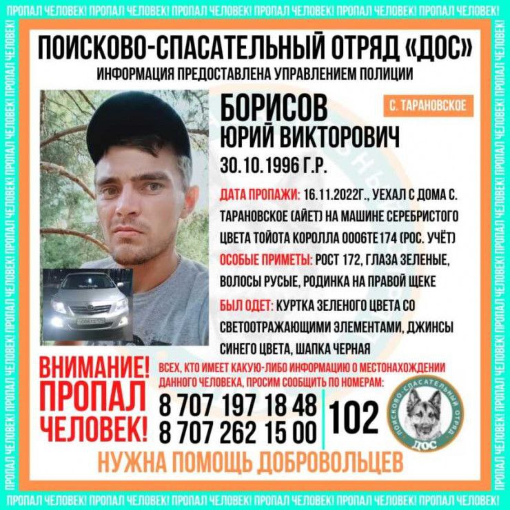 «В настоящее время проводятся поисковые мероприятия на территории района Б.Майлина и города Рудного, а также близлежащих районов. В ДП Костанайской области отметили, что в полицию с заявлением обратилась мать пропавшего. Просьба, кому что-либо известно о местонахождении Владимира Борисова сообщить по телефону «102»», - сообщает пресс-служба Департамента полиции Костанайской области.