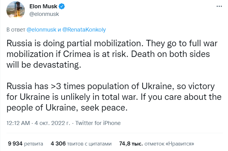 «Россия проводит частичную мобилизацию. Они пойдут на полную военную мобилизацию, если Крым будет в опасности. Потери с обеих сторон будут огромными. Население России более чем в три раза превышает население Украины, поэтому победа Украины в тотальной войне маловероятна. Если вы заботитесь о народе Украины, стремитесь к миру», – написал Маск.