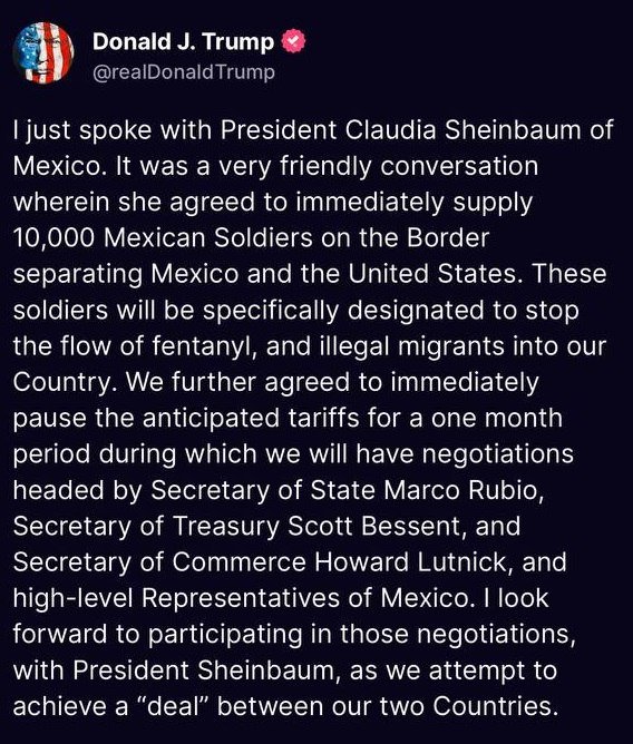 Во время телефонного разговора с президентом Мексики Клаудией Шейнбаум Трамп назвал переговоры «дружескими» и подчеркнул, что стороны продолжат работу над долгосрочным соглашением. Позже он подтвердил договоренность в своей соцсети Truth Social.