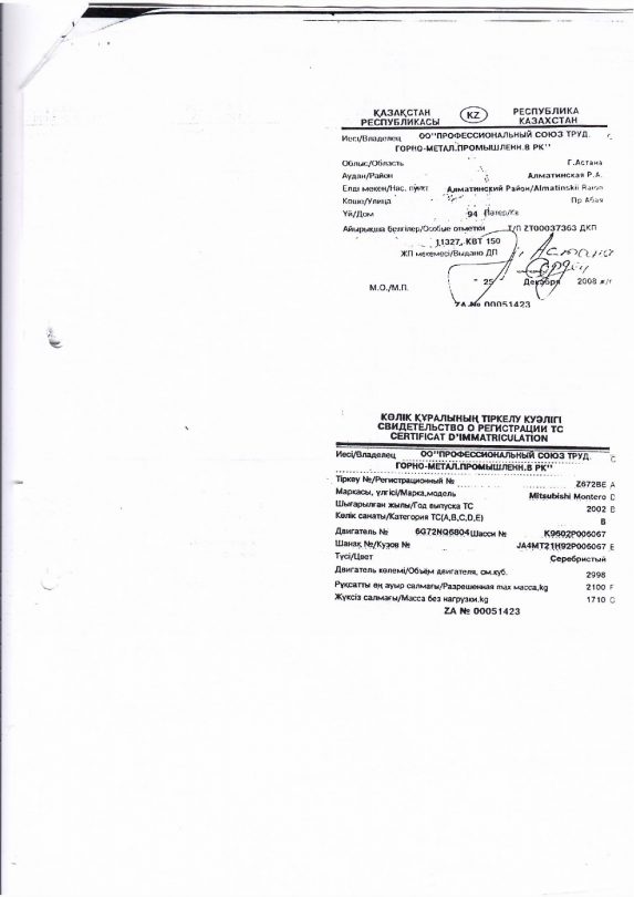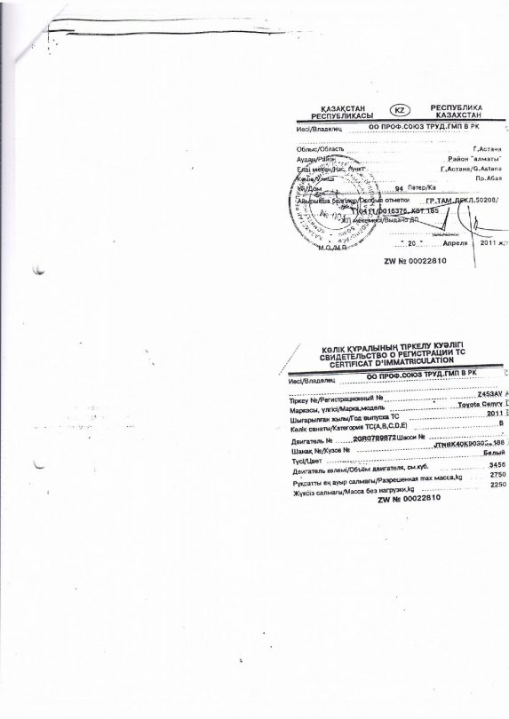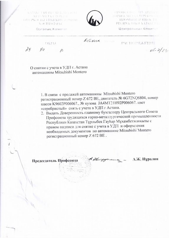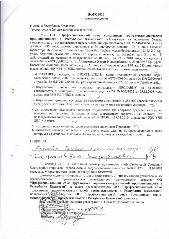 В конце декабря 2010 года отраслевой профсоюз продал автомобиль марки Mitsubishi Montero 2002 года выпуска Хасену Кыдырбековичу Айдарханову. По одним данным – по остаточной стоимости за 250 тысяч тенге, а по другим – в аварийном состоянии. В выписке из протокола заседания их совета от 21 декабря 2010 года указано, что этот автомобиль находится в аварийном состоянии. Хотя, по словам бухгалтера организации, документов, подтверждающих, что автомобиль был в аварийном состоянии, нет.