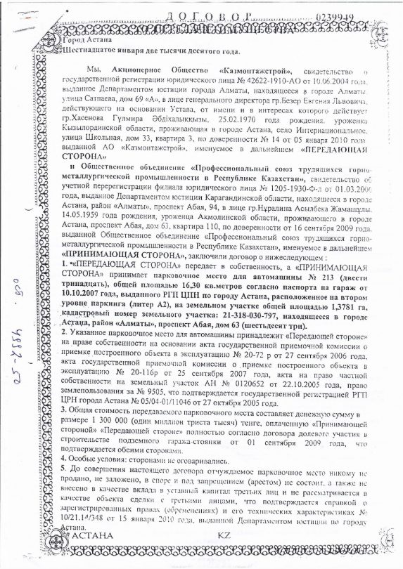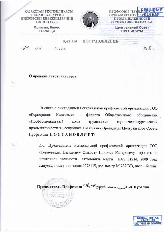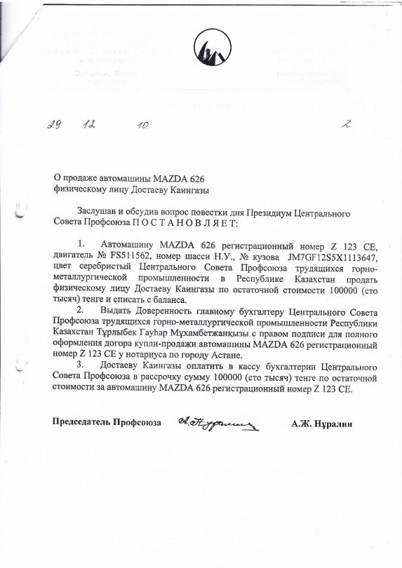 Тогда же, в декабре 2010 года, согласно такому же постановлению президиума центрального совета, отраслевой профсоюз продал в аварийном состоянии автомобиль марки Mazda 626 Каингазы Достаеву за 100 тысяч тенге. Однако, как утверждает наш источник, документов о неисправности автомобиля не поступало.