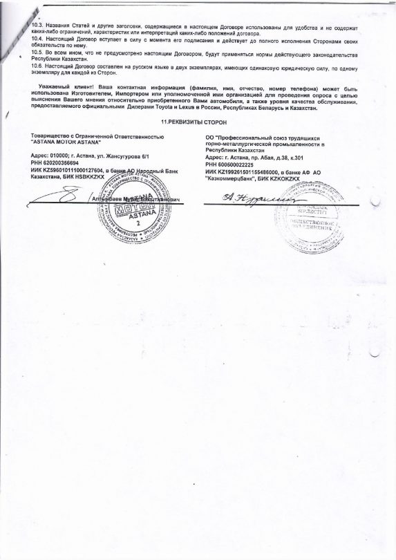 В августе этого же года отраслевой профсоюз приобретает в автосалоне новый автомобиль Toyota Highlander чёрного цвета 2012 года выпуска за 9,6 млн тенге.