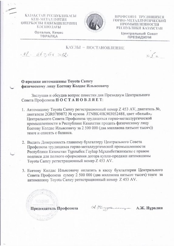 Тогда же, согласно внутренним документам, профсоюз продал практически новый автомобиль Toyota Camry 2011 года выпуска Колдасу Ильясовичу Есетову за 2,5 млн тенге. Однако его балансовая стоимость то время составляла 7,7 млн.