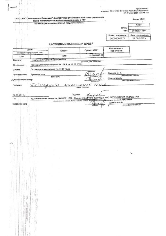В конце августа 2012 года региональная профсоюзная организация ТОО «Корпорация Казахмыс», которая была филиалом отраслевого профсоюза, приобрела дом с земельным участком, который находится в поселке Кудукагаш Акмолинской области, за 15 млн тенге у супруги председателя Жумакул Нуралиной.