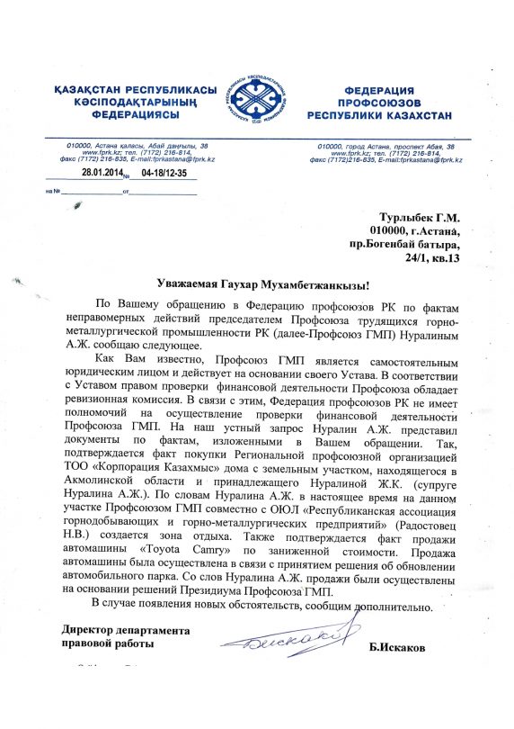 «Прикрываясь, на мой взгляд, положениями вышеуказанного закона и якобы благими намерениями, А. Ж. Нуралин, будучи председателем одного из крупнейших республиканских отраслевых профсоюзов, достаточно долгое время остается безнаказанным за свои деяния», – заявил источник.