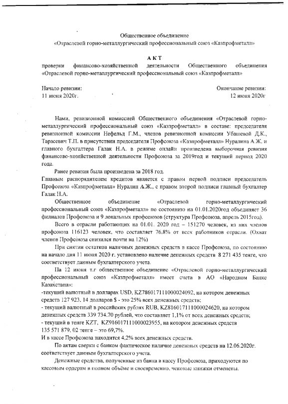 «Ещё в 2015 году бывший советник председателя отраслевого профсоюза К. Ш. Валиев в своём обращении к членам исполкома говорил о безынициативности действующего председателя, его единоличном обращении с имуществом профсоюза, сокрытии своих манипуляций, нецелевом использовании членских профсоюзных взносов профсоюза «Кәсіп Қазақмыс», а также о необходимости проведения внутренних разборок в отраслевом профсоюзе», – продолжил наш источник.