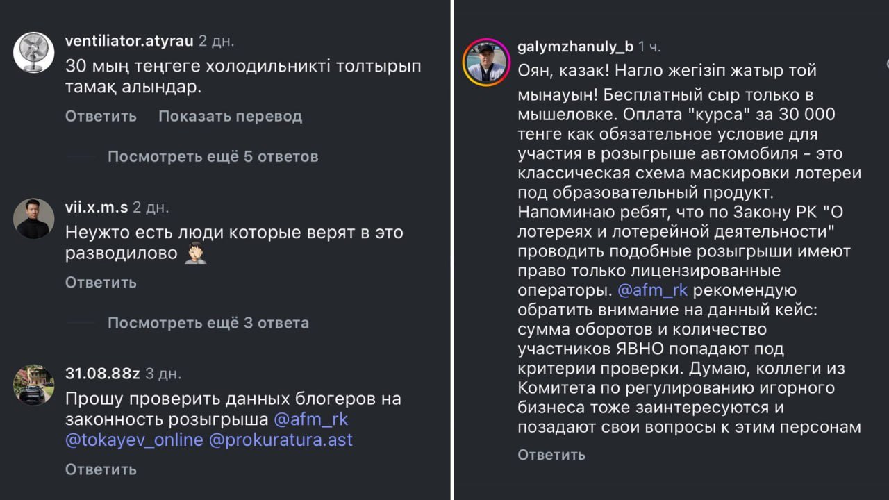 Характерно, что ещё до официального обращения в комитет в комментариях под постами блогеров пользователи отмечали госорганы и даже обращались к президенту с просьбой проверить законность розыгрыша.