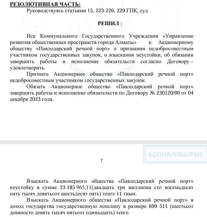 Хотя... «Павлодарский речной порт» занимался реконструкцией Сайрана, которая должна была завершиться ещё в конце мая 2025 года, но не закончена до сих пор. Зато 1 сентября СМЭС Алматы по иску городского управления развития общественных пространств признал ПРП недобросовестным подрядчиком.
