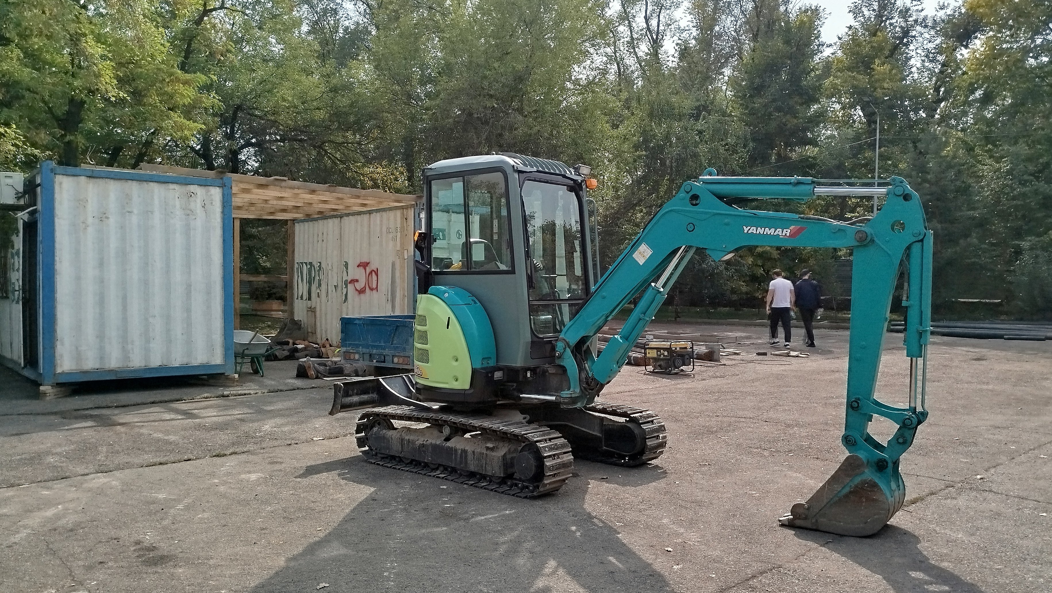 С 14:00 около точки сбора началась активность: рабочие шлифовали болгаркой бетон, погрузчики возили щебень, и даже парень на электроцикле куда-то повёз пустые бочки. Возможно, с появлением журналистов это никак не было связано, а просто закончился обед.