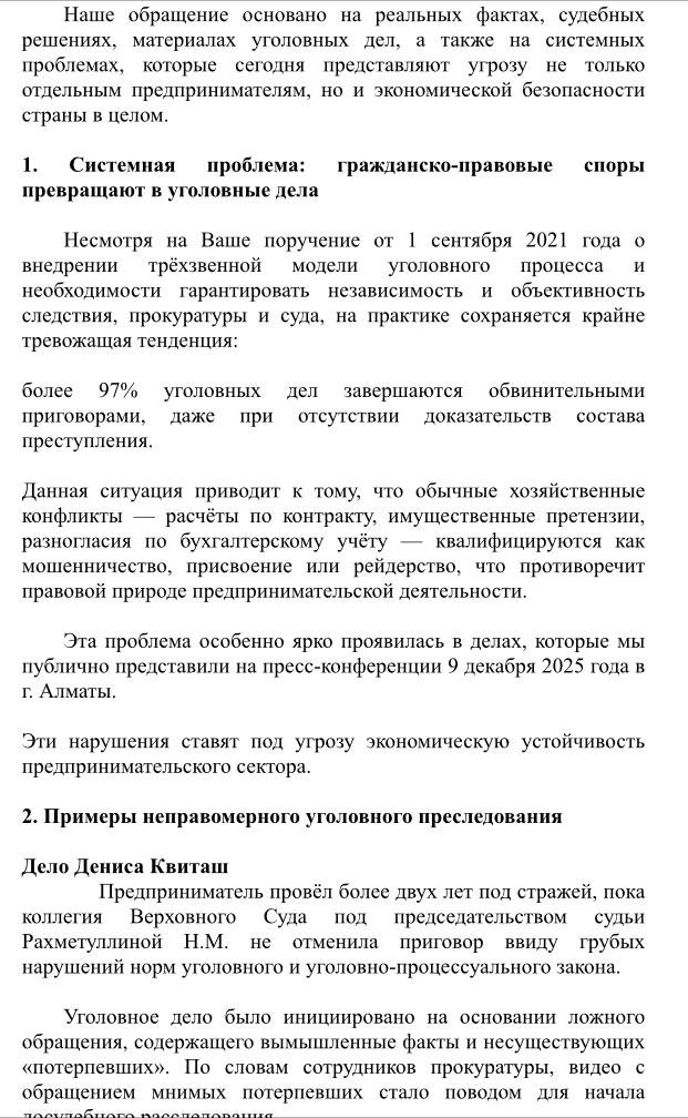 — Мы заявили о проблеме давления правоохранительных органов на бизнес в Казахстане. Почему-то в последнее время обычные хозяйственные споры с их подачи перерастают в уголовные дела. Причём нередко эти дела возбуждаются лишь на основании заявлений, как это было, например, в моём случае. Это нонсенс, но моё дело не было зарегистрировано в Едином реестре досудебного расследования, как того требует закон. Тем не менее, его расследовали и загнали в райсуд. Поэтому участники пресс-конференции передали через палату предпринимателей «Атамекен» письмо на имя президента с просьбой защитить бизнес от неправомерных действий правоохранительных органов, а также органов прокуратуры и судов. В нём в качестве примера неправомерного уголовного преследования была приведена моя история.