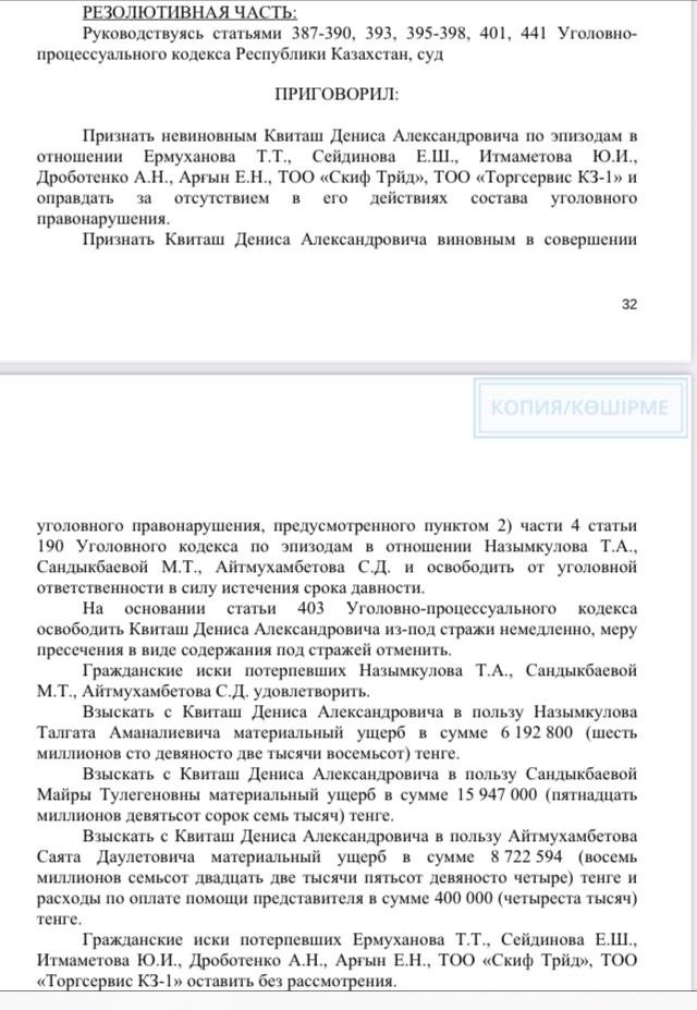 Вы не признавали вину во время следствия и суда и не шли на сделку с прокурором. Тем не менее суд первой инстанции назначил вам относительно мягкое наказание, предусмотренное ч. 4 ст. 190 УК РК, — шесть лет лишения свободы из максимальных 10. Как так получилось, поясните, ведь вы же были признаны виновным в мошенничестве в особо крупном размере?