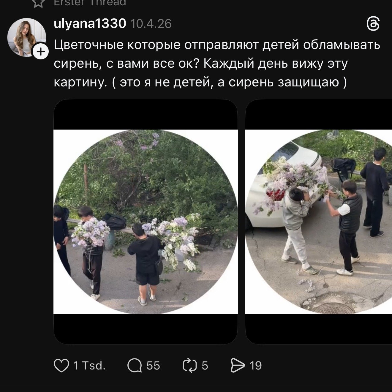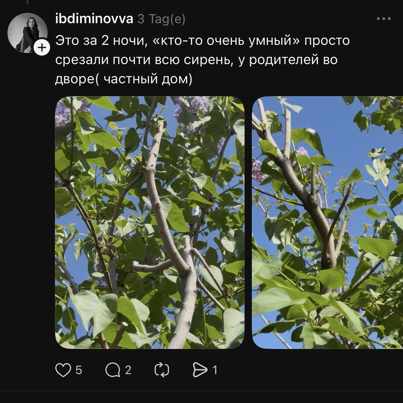 «Это за две ночи кто-то очень умный просто срезал почти всю сирень у родителей во дворе»,пишет девушка в Threads.
