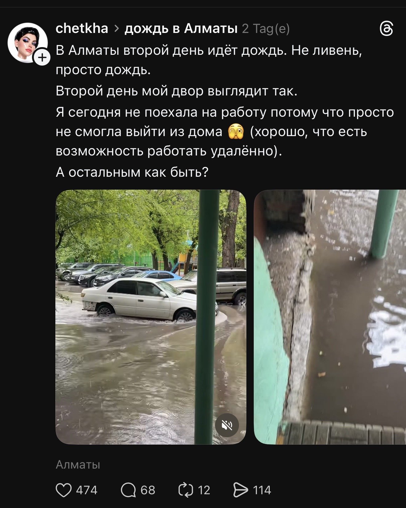 16 и 17 апреля в Алматы лил дождь. Не ураган был, не тайфун — просто дождь. Но город, как всегда, поплыл. Дворы превратились в озёра, а люди не могли выйти из подъездов.