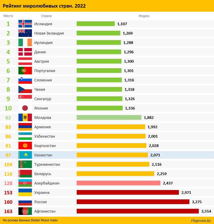 В рейтинге миролюбивых стран в 2022 году Казахстан оказался на 97 месте и потерял 29 позиций в сравнении с прошлым годом.