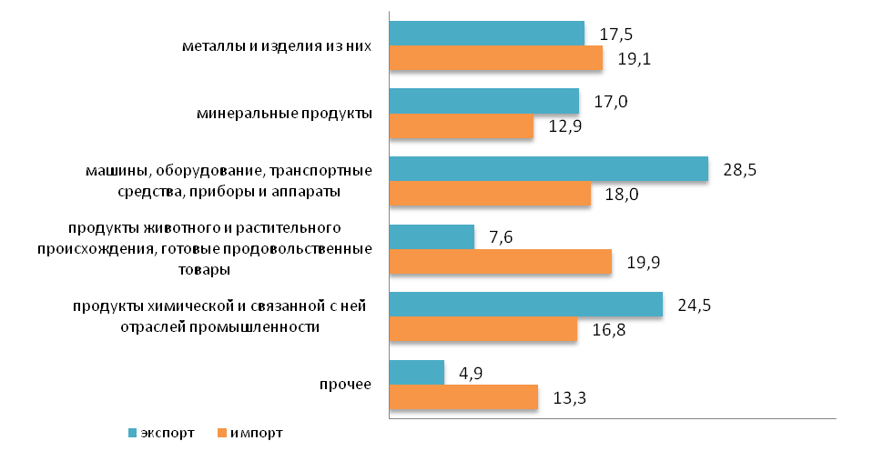Наибольшую долю в экспорте со странами ЕАЭС занимают машины, оборудование, транспортные средства, приборы и аппараты (28,5%), далее следуют продукты химической и связанной с ней отраслей промышленности (24,5%).