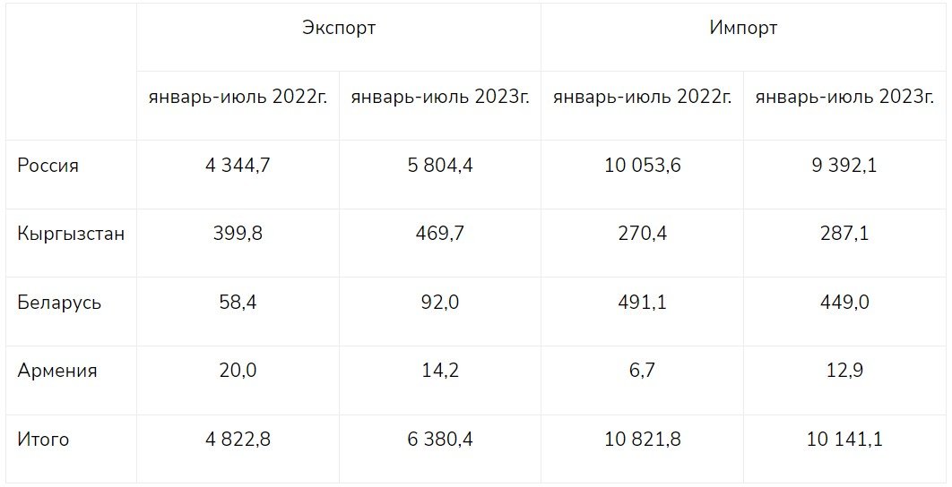 «В общем объёме внешнеторгового оборота Республики Казахстан со странами ЕАЭС Армения занимает 0,1%, Беларусь – 3,3%, Кыргызстан – 4,6%, Российская Федерация – 92%», – отмечают аналитики. Надо добавить, что этот показатель не изменён.