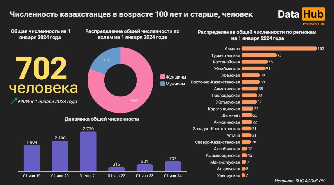 На каждого мужчину, достигшего ста лет, приходится сразу по четыре женщины такого же возраста. Большинство долгожителей живут в городах, а лидирует по их количеству Алматы. На втором месте — Туркестанская область, на третьем — Костанайская.