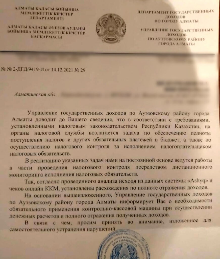 22 декабря предприниматели сообщили, что Комитет государственных доходов прислал им уведомление о том, что количество пробитых чеков и количество людей, прошедших на объект через Ashyq – не соответствуют друг другу.