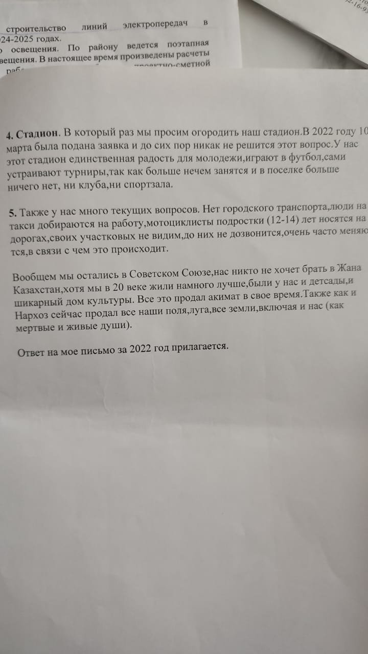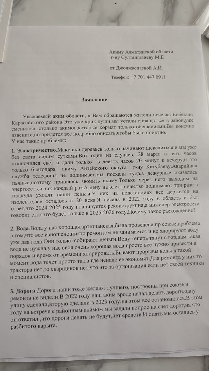 Люди постоянно обращаются и в районный акимат, и в областной, но тщетно. Либо все обращения пересылают в сельский же акимат, либо отправляют отписки.