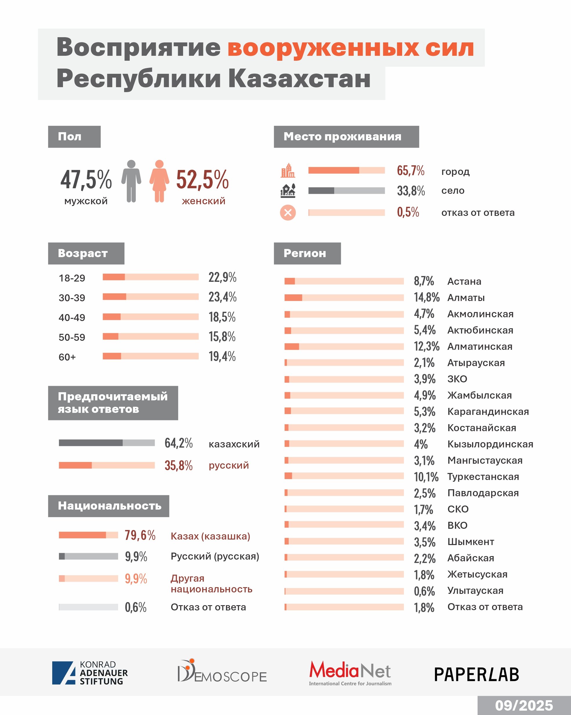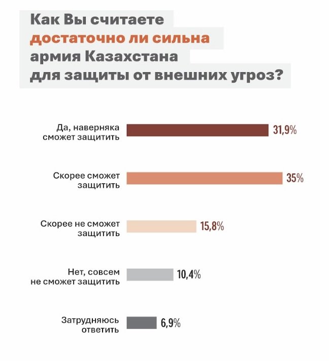 Оценка рисков возможных военных конфликтов с участием Казахстана в ближайшие пять лет разделила общество. 14 % допускают такой сценарий, 28 % считают вероятность средней, тогда как 42,9 % отвергают возможность вовлечения страны в военные действия.